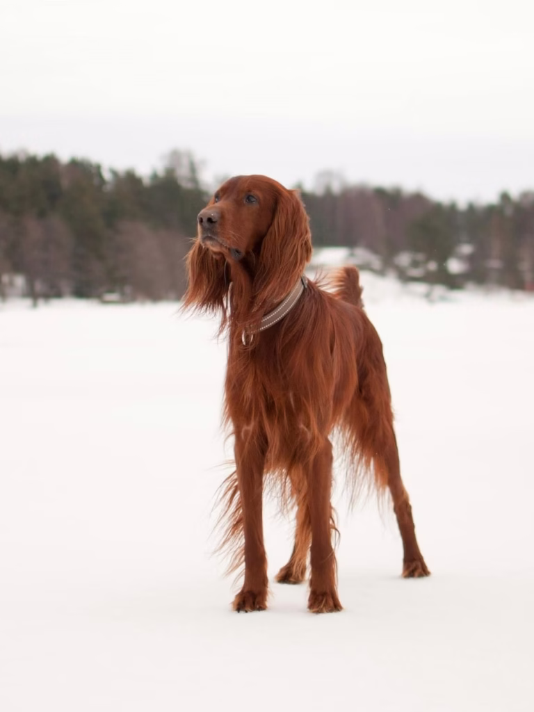 Seter irlandzki to pies o smukłej, eleganckiej sylwetce, która emanuje zarówno wdziękiem, jak i siłą. Jego ciało jest proporcjonalnie zbudowane, z dobrze rozwiniętymi mięśniami i głęboką klatką piersiową, co pozwala mu na wytrzymałość i szybkość. Charakterystyczną cechą setera jest jego długa, jedwabista sierść o intensywnie kasztanowoczerwonym kolorze, która tworzy efektowne „pióra” na uszach, klatce piersiowej, brzuchu, ogonie i nogach.